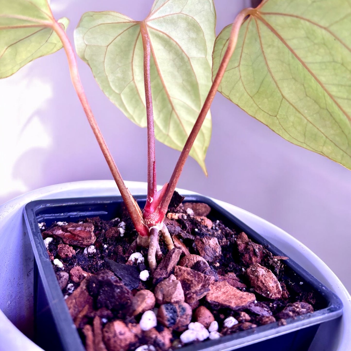 Con sus hojas en forma de corazón, de un verde oscuro casi negro, y esos tallos rojizos que parecen sacados de una pintura, este híbrido es pura poesía tropical. Es una planta que dice “mírame”, mientras transforma cualquier espacio en un rincón digno de coleccionistas y plantlovers con buen gusto.