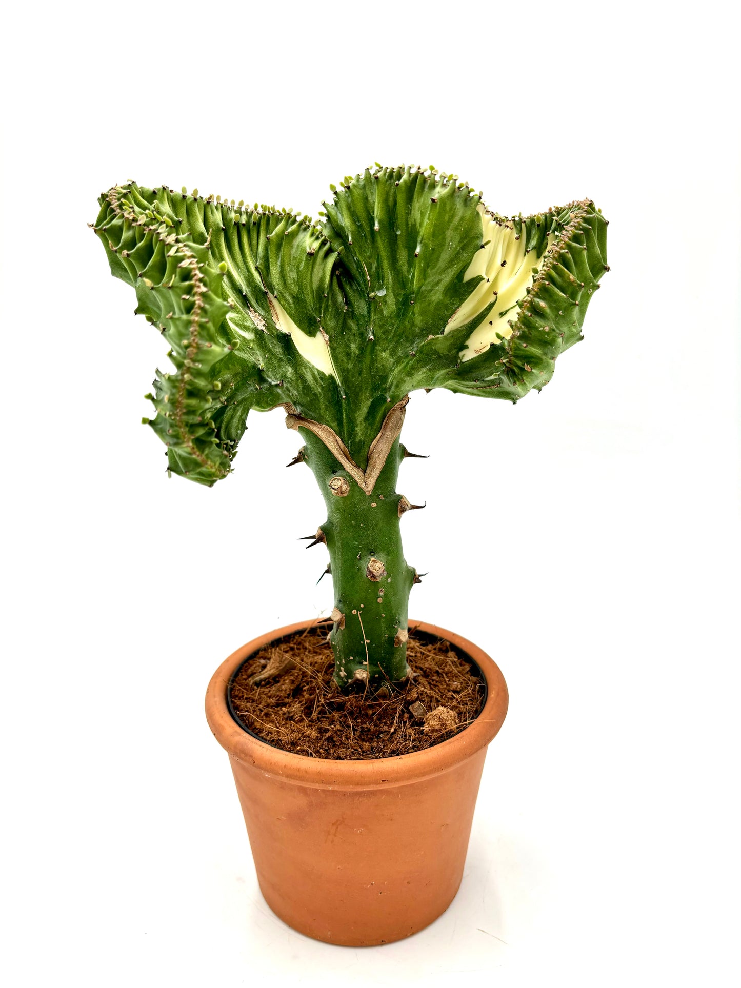 Si buscas una planta que parezca sacada de un jardín extraterrestre, la Euphorbia Lactea Cristata es la joya surrealista que necesita tu colección. Con su fascinante forma de abanico que se ondula como una cresta, esta planta parece una escultura natural. Su follaje en tonos verdes, blancos y rosados la convierte en una verdadera obra de arte botánica que aporta un toque artístico y atrevido a cualquier espacio.