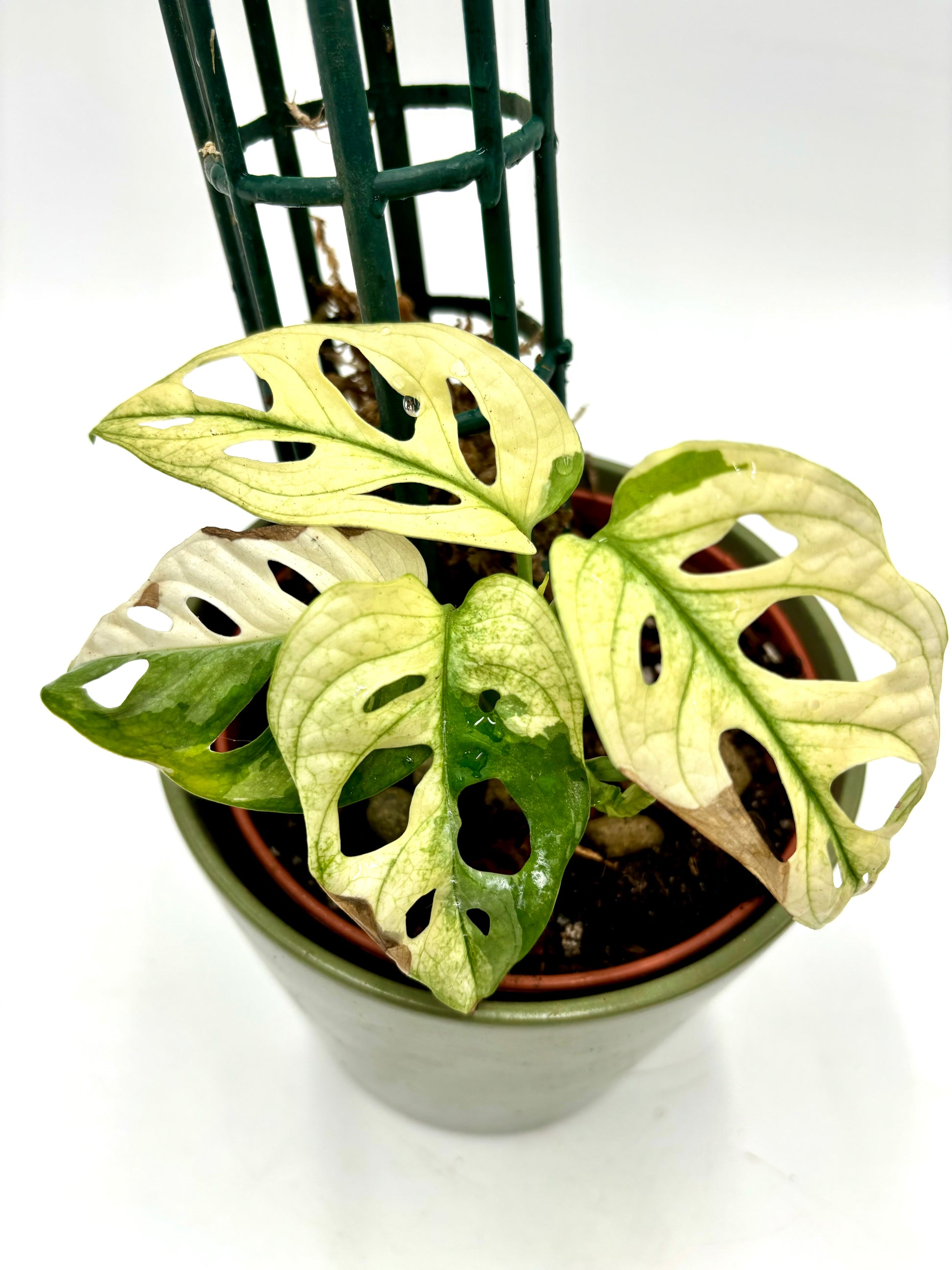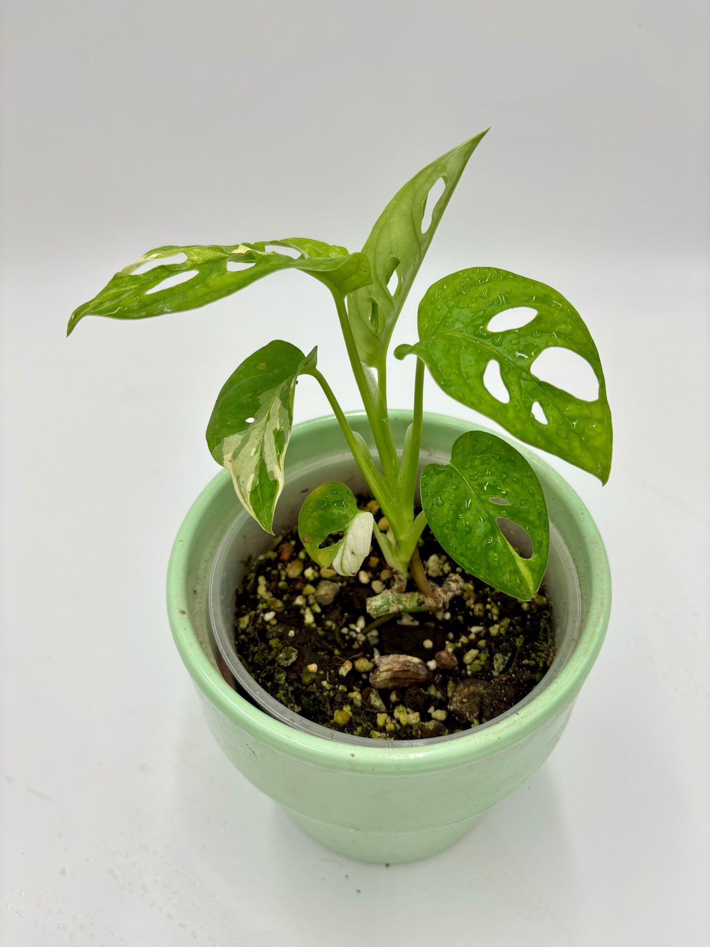 Cuidados (o cómo mantener estas ventanas tropicales siempre en su mejor forma): 🌞 Luz brillante e indirecta: La Monstera Adansonii Variegata ama la luz brillante e indirecta, lo que ayuda a mantener su variegación vibrante y definida. Colócala cerca de una ventana con luz filtrada para evitar que el sol directo queme las partes blancas de sus hojas. Truquito extra: si ves que las hojas empiezan a perder su color blanco, dale un poco más de luz, ¡esto ayudará a intensificar la variegación! 💧 Riego moderado: Esta reina de la selva tropical prefiere un riego controlado. Riega cuando la capa superior del sustrato esté seca al tacto, evitando encharcamientos. Un truquito : usa agua filtrada o de lluvia para imitar su ambiente natural y mantener las raíces felices. Las hojas amarillas pueden ser una señal de exceso de riego, ¡así que ve ajustando hasta encontrar el equilibrio perfecto! 🌿 Humedad alta: La Adansonii Variegata ama la humedad, como buena planta tropical. Si vive en un ambiente seco, puede colocarla cerca de un humidificador o agruparla con otras plantas para aumentar la humedad. Truco fácil : una bandeja con agua y piedras debajo de la maceta también ayudará a crear el ambiente húmedo que necesita para mantenerse saludable y feliz. 🥂 Fertilización ocasional: Dale un poco de fertilizante equilibrado para plantas de interior una vez al mes durante la primavera y el verano. Esto fomentará un crecimiento vigoroso y hojas llenas de variegación. En invierno, reduzca la fertilización para que conserve su energía y tome un descanso. 🏺 Maceta con buen drenaje: La Monstera Adansonii Variegata necesita un sustrato aireado y bien drenado. Utilice una mezcla para plantas tropicales con un toque de perlita o corteza de pino para evitar el encharcamiento. Un truquito especial : si notas que las raíces se están volviendo visibles en la superficie, es una señal de que tu planta necesita una maceta un poco más grande para seguir expandiéndose. Soporte para trepar: Esta Monstera es una trepadora nata, y le encantará que le des un soporte como un tutor de musgo o una estaca para escalar. Esto no solo ayudará a que crezca más fuerte, sino que también resaltará sus hojas variegadas, convirtiéndola en una verdadera obra de arte vertical en tu hogar.