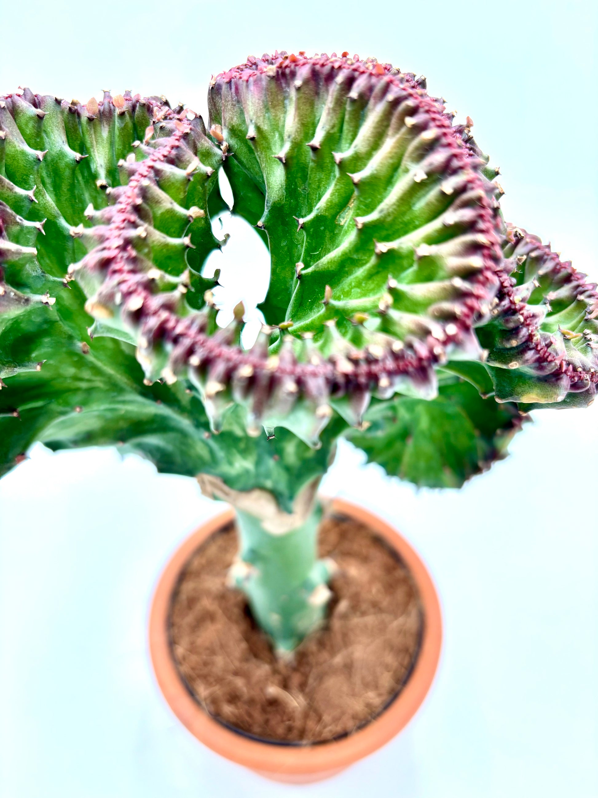 🌞 Luz brilhante e indireta: A Euphorbia Lactea Cristata adora luz brilhante e indireta, então coloque-a perto de uma janela ensolarada, onde ela receba luz filtrada. Ela pode tolerar um pouco de sol direto, mas com moderação, especialmente pela manhã ou no final da tarde. Dessa forma, suas cores permanecerão vibrantes e seu formato único permanecerá forte!